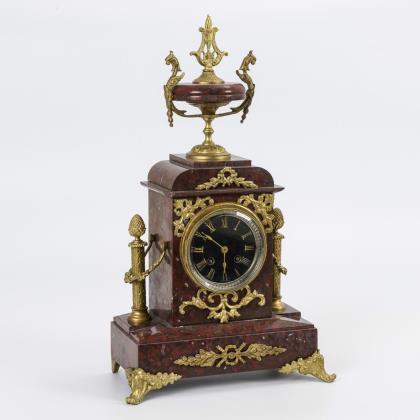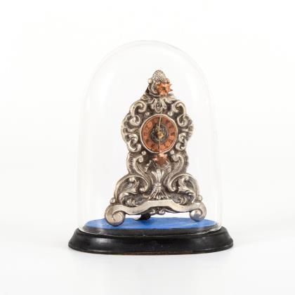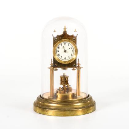 Mit 3 Zapfen bekröntes Uhrwerk auf 2 glatten Säulen und rundem Profilsockel mit Perlbändern. Mit Glasdom