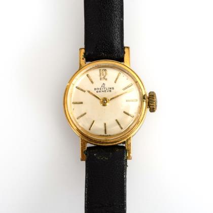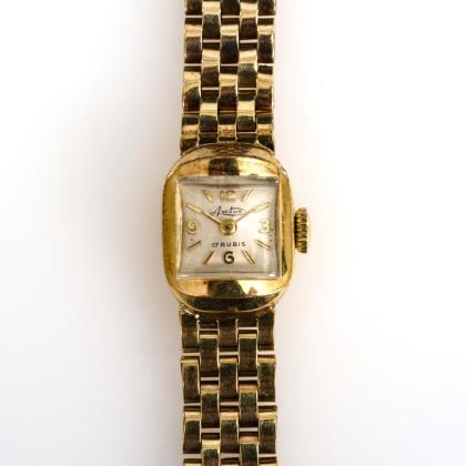 Galonné-Gehäuse mit guillochiertem Rückdeckel und leerer Wappenreserve. Gelbgold doubliertes Zangenarmband mit Zuggliedern