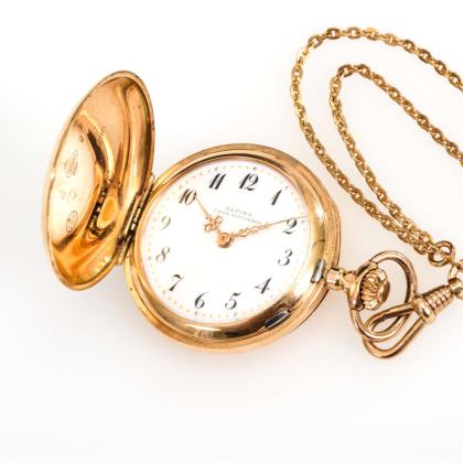 Goldene Damentaschenuhr an langer goldener Uhrenkette
