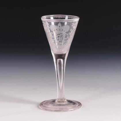 Konische Kuppa mit einem eingestochenen Luftblasenkranz am Boden, nodierter Hohlschaft, Rundfuß mit umgeschlagenem Rand, Abriss. Schauseitig ein mattgeschliffenes, teils geblänktes Wappen mit zwei gekreuzten Pfeilen und Helmzier