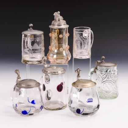 3 Krüge mit blauen bzw. weinroten Tropfenaufschmelzungen, 1 formgepresster Krug, 1 Krug mit Schliffdekor und der Aufschrift "Denk an mich", 1 kleiner Krug mit Ätzdekor und 1 Krug mit Beerennuppen