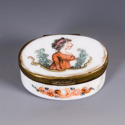 Ovale Dose mit metallmontiertem Scharnierdeckel. Auf dem Deckel ein Damenbildnis, auf der Wandung Blumenbuketts