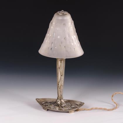 Pilzförmiger Schirm mit Nuppenrelief. Auf floral reliefiertem Schaft aus vernickelter Bronze, ovaler Fuß. Elektrifiziert (Funktion nicht geprüft)