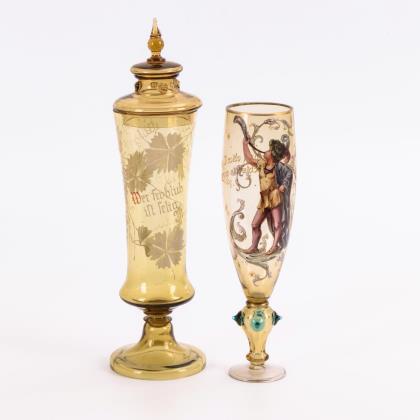 Pokal mit bauchiger Kuppa (H 19,5 cm) und Pokal mit konischer Kuppa (H 25,5 cm). Beide mit weißem Emailrand, 1x mit Abriss