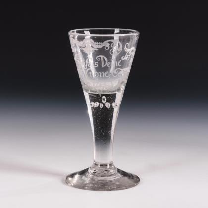 Leicht konische, am Ansatz facettierte Kuppa, facettierter Balusterschaft, Rundfuß. Mit symbolischen Darstellungen und Sprüchen