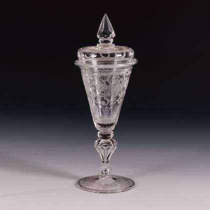 Konische, am Ansatz facettierte Kuppa, originaler Knaufdeckel, wabenfacettierter Hohlbalusterschaft, Rundfuß mit umgeschlagenem Rand, Abriss. Fein mattgeschliffenes, teils geblänktes Ornamentdekor mit Blumenkörben