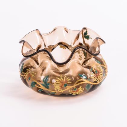 Längsoptisch formgeblasene, gedrückt gebauchte Vase mit siebenfach auslappendem Mündungsrand, ausgekugelter Abriss. Umlaufend ein gemaltes Chrysanthemenband