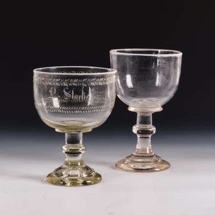 Bauchige Kuppa mit weißem Emailrand, massiver, nodierter Schaft und Rundfuß, 1x mit Abriss. 1x mit vegetabilen Schliffbordüren und dem Namen "L. Starke"