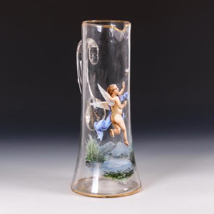Halbovoide Kuppa, längsoptisch geblasener Nodus und Balusterhohlschaft, Rundfuß. Bemalt mit Figuren zwischen Goldrocaillen und Blattfestons, auf dem Fuß das Monogramm "JZ"