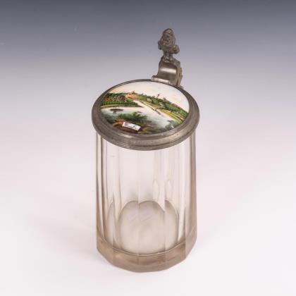 Mehrfach facettierter, leicht konischer Krug mit zinnmontiertem Scharnierdeckel und Zwergendrücker. Im Deckel eine Porzellanplakette mit der Ansicht von Bad Wimpfen am Neckar