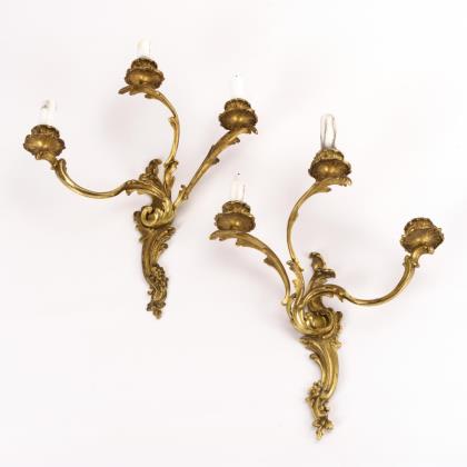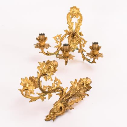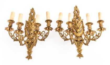 Wandappliken mit prächtigen Wandhalterungen im Louis-Seize-Stil und 4 teils gestuften Armen mit Rankenbesatz. Vasentüllen mit Schraubfassungen und Papp-Kerzenhülsen
