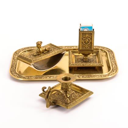 Kerzenleuchter, Fidibushalter und Löschwiege mit gleichem Reliefornament; Wiege zusätzlich mit applizierter Figur einer Sphinx. Tablett mit Putten im Reliefornament auf der Fahne