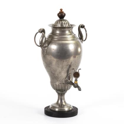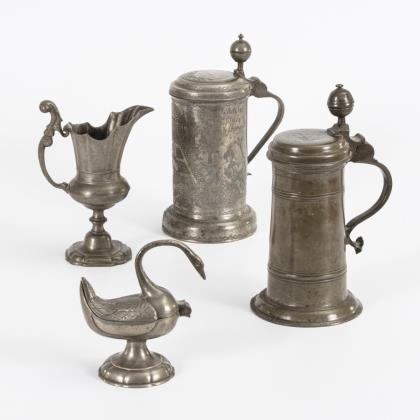 2 Walzenkrüge, Helmkanne und Schwanendose Zinn