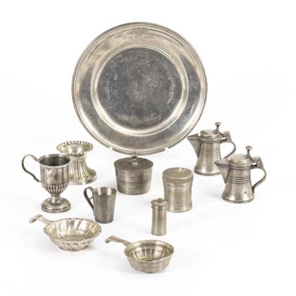 Teller mit graviertem Engel, Datum "1734" und mehreren Monogrammen. 2 Messkännchen, 1 Saliere, 3 Dosen, davon 2 mit Schraubdeckel, 2 Henkelbecher, 2 Henkelnäpfe