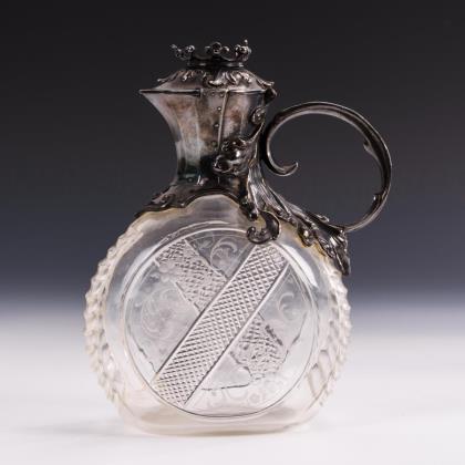 Bauchige Karaffe mit Steinel- und Schälschliff sowie Mattschliff-Ornament auf beiden Seiten sowie helmartige Montierung mit Verzierungen