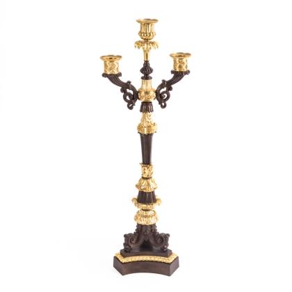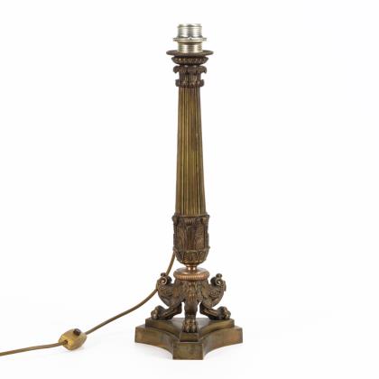 Bronzeleuchter mit Akanthusfriesen am Rundfuß und Ansatz des kannelierten Säulenschaftes. Eingesteckter Wachsteller mit Perlrand