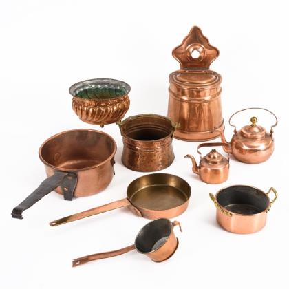 Wandmeste, Dreibeintopf mit Eisengriff, handgetriebener Übertopf mit Godronierung, 2 kleine Wasserkessel, Eimer mit Messinghenkel, Bratpfanne, Topf mit Messinghenkeln und Sieb