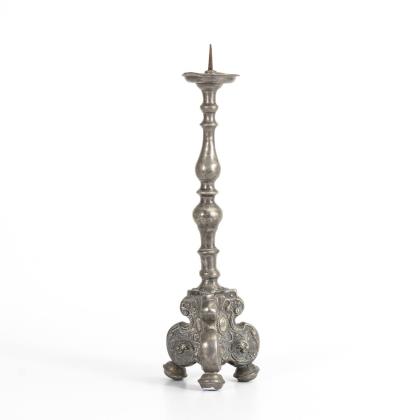 3-seitiger Fuß mit Rocaillen-Relief und leeren Kartuschen, geriffelter schlanker Balusterschaft, godronierter Wachsteller