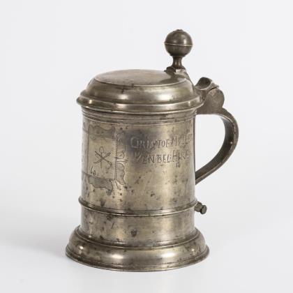 Fast die gesamte Wandung des Walzenkruges bedeckende, überaus prächtige Flechelgravur mit Neptun und Flussgöttern in idealer Gartenlandschaft sowie Sinnspruch: "Seth wie Nepthunus die Welten durchscheidet, wen er zu seiner Nünphen abschwimt". Auf dem Deckel Monogramm "CGW 1776". / Leicht konischer Walzenkrug, auf dem Deckel Gravur "C. Taute 1741". / Dose in Schwanform mit Rundfuß und Scharnierdeckel sowie Gravur "SM". / Ungemarkte Helmkanne mit Gravur "JGB 1739"