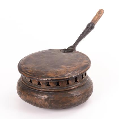 Aus einem dickwandigen Stück getriebener Bettwärmer mit Á-Jour-Scheibenfries und Scharnierdeckel; jeweils mit gebördeltem Rand. Angenietete Eisenhalterung mit Holzgriff