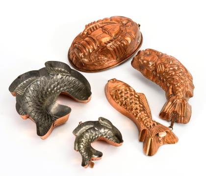 Getriebene ovale Backform mit Flusskrebs, 4 Backformen als Fisch