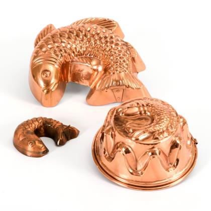 2 gekrümmte Fische, 1 runde Backform; jeweils reliefiert