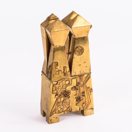 Konische Dose mit 4 verschiedenen Türmen, davon je 2 zusammen als Deckel klappbar. Auf der Wandung aufgelötetes abstraktes Ornament; innen roter Samt