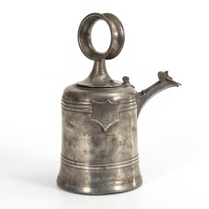 Glockenkanne mit Scharnierdeckel auf der Tülle sowie Ringhandhabe auf dem Deckel. Auf der Wandung appliziertes Wappen mit Besitzermonogramm, auf der Schulter weiteres Monogramm