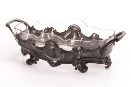 Längsovale Blumenschale mit stilisiertem Ornament- und Blütenzweig-Relief (Tränendes Herz) sowie hochgezogenen Handhaben. Originaler Glaseinsatz