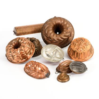 3 Guglhupfformen, 1 runde Form mit Blumen aus einem Herz, 1 Rehrücken, 4 ovale und 1 kleine runde Backform