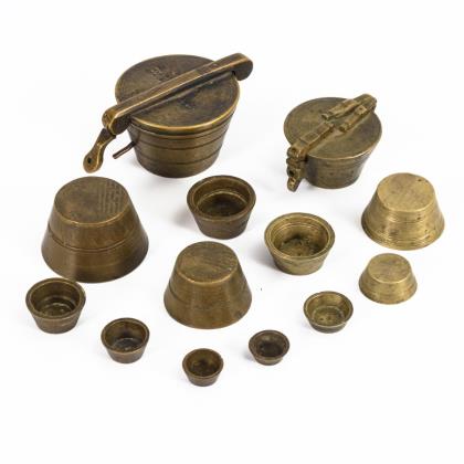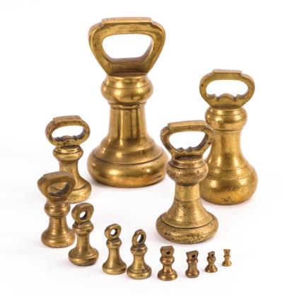 1-Pfund-Einsatzgewicht Nürnberg mit 7 "Bechergewichten". / Satz 8 englischer Stapelgewichte von 2 Pfund bis 1/4 Unze
