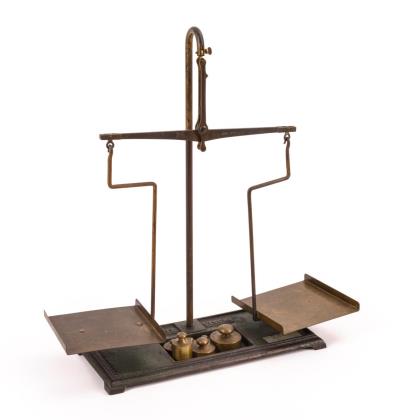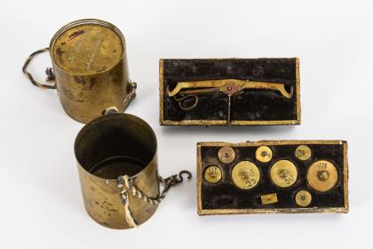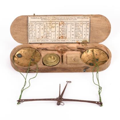 Messing-Balkenwaage mit 15 gleichen Gewichten; diese beschriftet (Louis, Duc, Napol usw.)