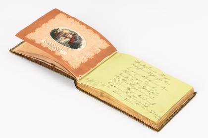 Gebundenes Freundschaftsalbum (Liber amicorum) mit Goldprägung am grünen Ledereinband sowie Goldschnitt. Einträge zumeist aus Müllheim, dabei 9 eingeklebte kolorierte Lithografien