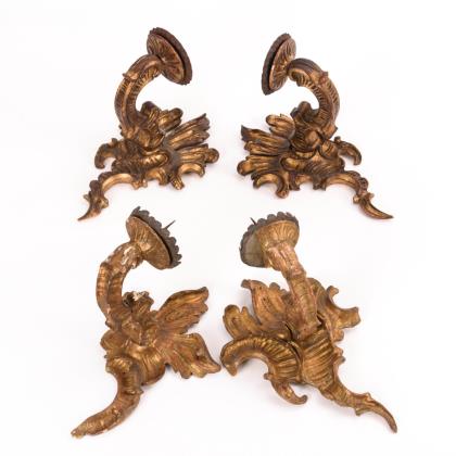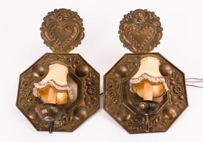 Oktogonales Wandblech mit gewölbtem Spiegel und vegetabil reliefiertem Rahmen sowie Aufsatz. Leuchterarm mit Papphülsen an den elektrischen Kerzen sowie Stoffschirm