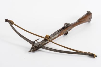 Allseits und auf dem Scharnierdeckel mit dichter Bänderung versehene "Kriegskasse". An den Seiten tordierte Tragegriffe, in der Front 2 Anlegen, auf dem Deckel das verdeckte Schlüsselloch. Deckel mit 9 Zuhaltungen (davon 2 fix), polierte Schlossabdeckung mit á jour gearbeitetem Rankenornament und Messing-Zierstück. Schloss mit vorhandenem Eingericht