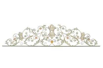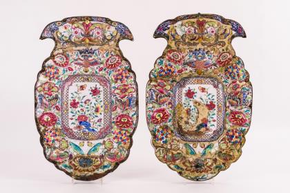 Auf dem geschweiften Grundbrett montierte, reliefierte Kupferplatten mit farbfreudiger Malerei auf weißem Grund: Blumen, Vögel und Schmetterlinge sowie ein gekrönter Doppeladler