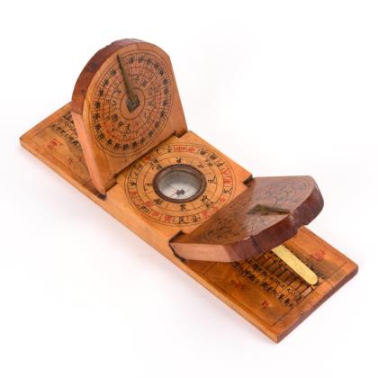Als Transportbüchse dienende Waagschalen. Innen aufklappbare Füllung mit Balkenwaage, 8 Gewichten (2-100) und Ausgleichsgewicht sowie 1 Haltestab aus Holz