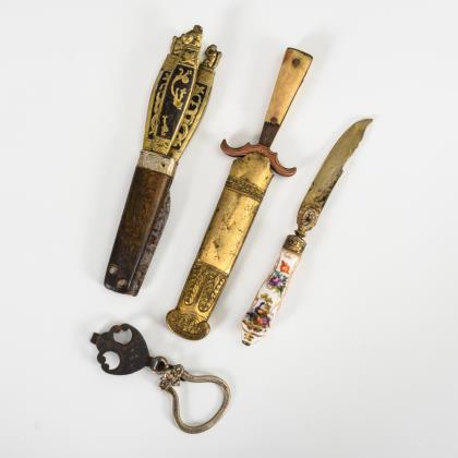 Kästchen allseits mit Blumenornament in den Scheinkassetten; auf dem Scharnierdeckel Reste einer figürlichen Malerei. / Geldkatze bzw. Fatschen mit gesticktem Schild "Freundschaft". / Steinschloss-Feuerzeug mit Gravur. / Lichtputzschere