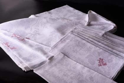 Tischwäsche mit Floral- und Ornamentdekoren. Weißstickereimonogramm FJ