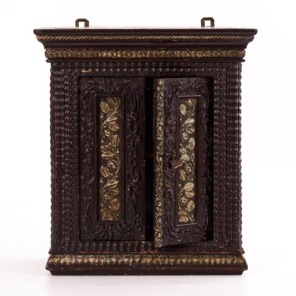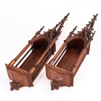 Aufwändig geschnitzte Gehäuse zur Wandmontage mit Maßwerk, Fialen und krabbenbesetzter Turmspitze