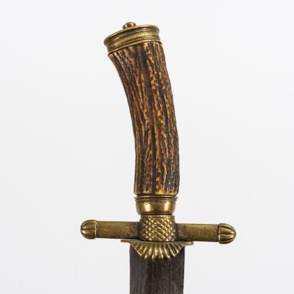 Schlankes Messer mit Hechtklinge, Griffschalen aus Nashorn(?) fellartig beschnitzt