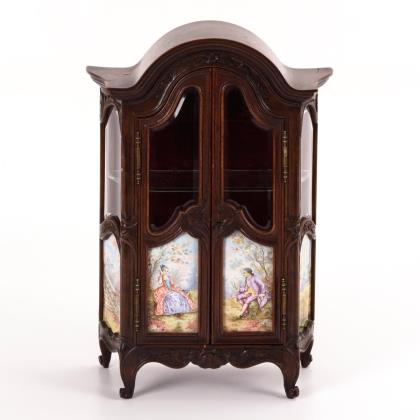 3-seitig facettiert verglaster Modellschrank in barocker Form. Die unteren Füllungen mit bemalten Emailplatten: Junges Paar in Rokoko-Kostümen in einer Parklandschaft. Innen mit rotem Samt ausgeschlagen