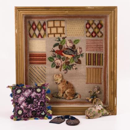 Großes Stickmustertuch mit aufwendigen Stickproben, plastisch geknüpften Tieren und mit Glasperlen teilbestickt. Verglast und gerahmt. Kleines Zierkissen mit Motivstickerei, monogrammiert und datiert M. Sch. 1905. Gestrickter Perlbeutel mit Kordeldurchzug. Gehäkelte Geldkatze, mit Metallperlen teilbestickt, 2 Verschluss-Metallringe