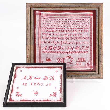 Rote ABC-Stickereien in verglasten Rahmen. 1 datiert 1925. Monogramm ungedeutet