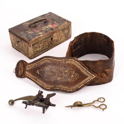 Wismutkästchen, Feuerzeug, Dochtschere und Geldgürtel