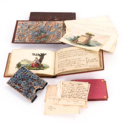 Kleines Stammbuch mit zahlreichen leeren und 5 eingelegten beschriebenen Blättern, diese von 1842/43 aus Keilhau, darunter von W. Middendorf, einem der Leiter des ersten Kindergartens ebd. / Großer Schuber mit zahlreichen Blättern zumeist aus Magdeburg, Rudolstadt und Jena (1797-1838), darunter von C. Bianchi, 2x mit studentischen Zeichnungen, 2 Aquarelle und 2 aquarellierte Drucke. / Gebundenes Buch zumeist Breslau, Strelitz und Schweidnitz (1820-27), darunter 2 gestickte Blumen, 2 Aquarelle und 3 eingeklebte aquarellierte Lithografien
