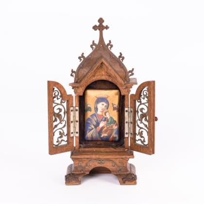 Die Heilige Familie hinter der Verglasung mit neogotischem Zierwerk im Rahmen mit "Spieluhr" (läuft, mehrere Weihnachtslieder). / Verglaste Berliner Leiste; darin Drahtarbeit mit Steinen einer Jerusalem-Wallfahrt und Lithografie (Madonna und Jesus mit brennenden Herzen)