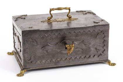 "Kriegskasse" mit gotisierenden Verzierungen, Tatzenfüßen und Tragegriff sowie Schloss mit 3 Verriegelungen