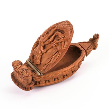 Leicht gerundeter Scharnierdeckel, im Deckel Ornamentkartusche mit Monogramm "AAD" und Datum. Dazu 6 opalinweiße, beschriftete Apothekenflaschen sowie 2 Glasmörser ohne Pistill