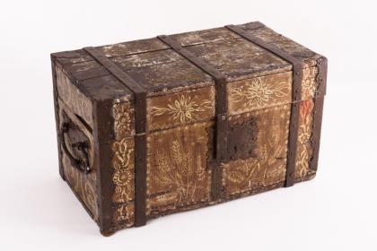 Quadertruhe mit seitlichen Tragegriffen, umlaufenden Bändern, geschweifter Schlossabdeckung und Fallriegel sowie allseits gemaltes „Wismut“-Ornament. Trockenrisse, einige Ausbrüche, Malerei jünger, teils silberbronziert